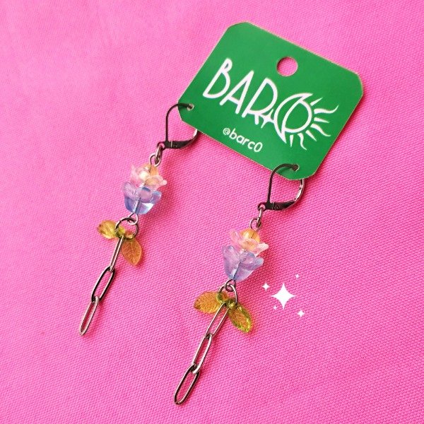 Aros con dijes de vidrio con acabado tornasol, cuenta tornasol, dijes de acrilico, cadena y brisuras de acero quirurgico