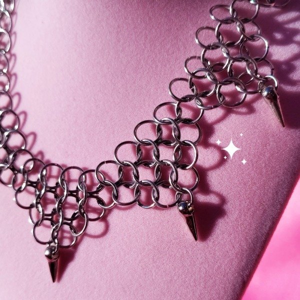 Collar de tejido medieval. Las argollas y cadenas son de acero quirurgico, los dijes de puas de aleacion. Funciona como gargantilla pero puede usarse más suelto.