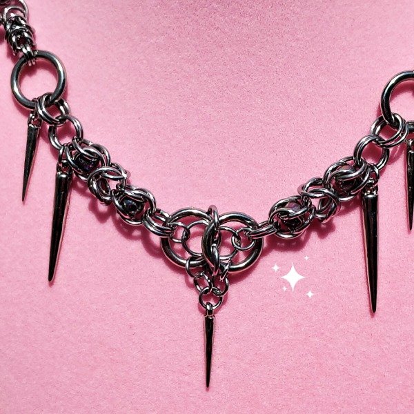 Collar de tejido medieval. Las argollas y cadenas son de acero quirurgico, perlas negras tornasol engarzadas, los dijes de fundición. Todos los collares son regulables y tienen una extensión.