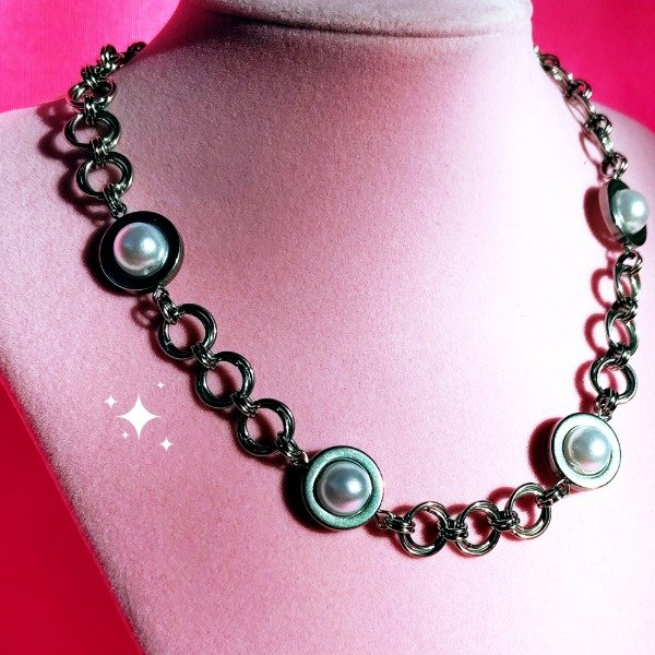 Collar de tejido medieval. Las argollas, dijes y cadenas son de acero quirurgico, las perlas de acrilico. Funciona bien como gargantilla y collar.