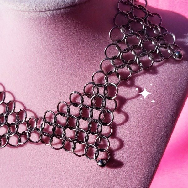 Collar de tejido medieval. Las argollas, bolitas y cadenas son de acero quirurgico. Funciona como gargantilla, se puede usar algo suelto.