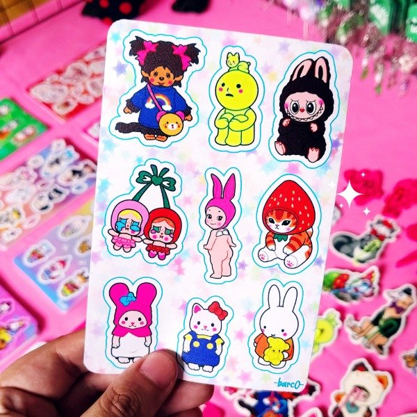 Plancha de stickers sobre vinilo blanco con impresión UV, resistente al agua y de gran durabilidad.